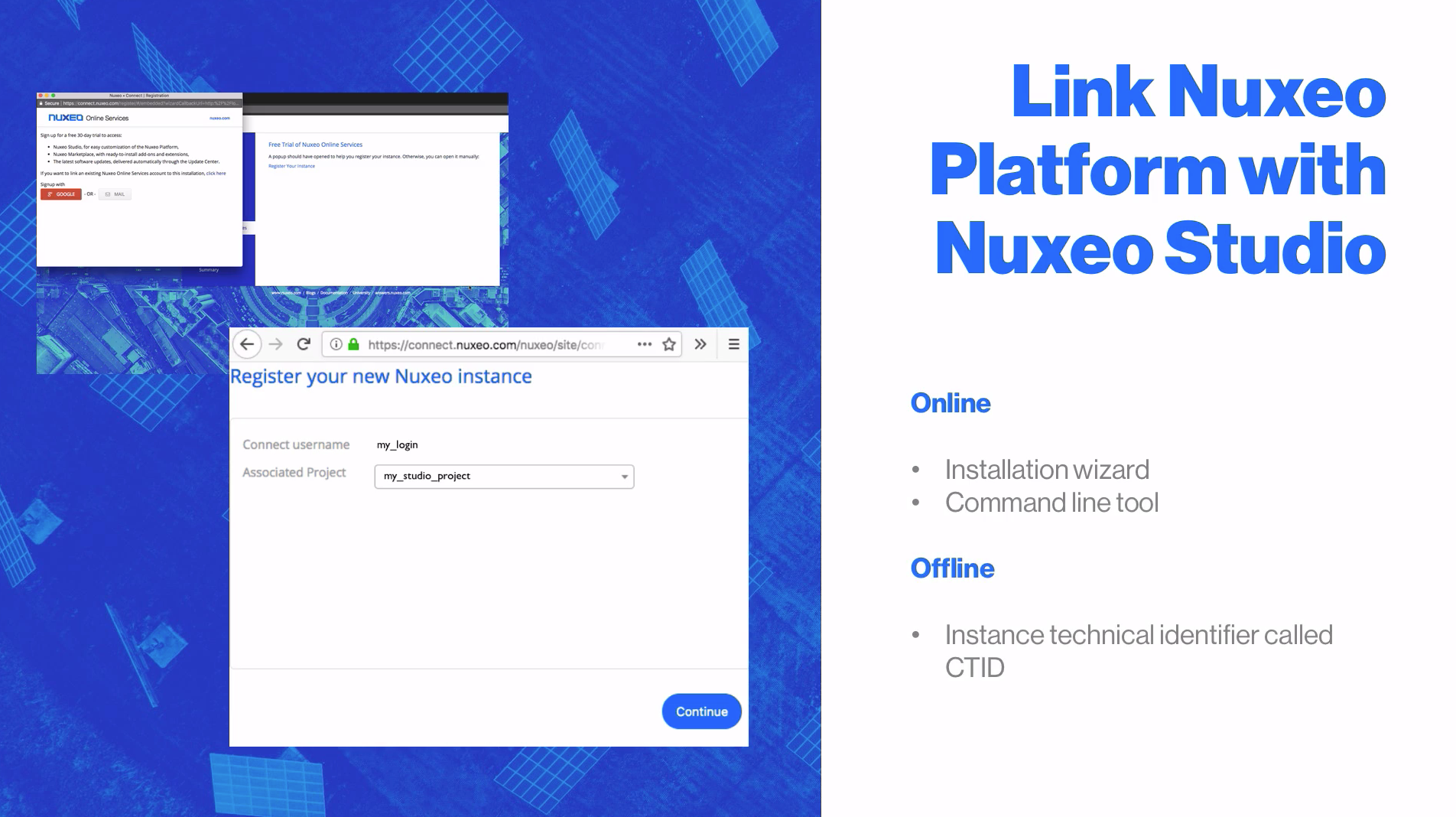 Registering your Nuxeo application with Nuxeo Online Services will let you easily install patches and bug fixes, install addons from the Nuxeo Marketplace, or update your application with your Nuxeo Studio customization, all that directly from the Nuxeo Platform.
