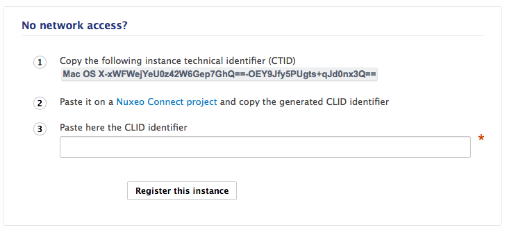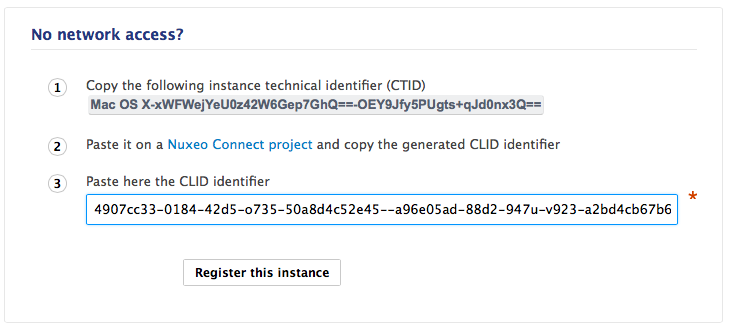 In Nuxeo Admin Center, paste this identifier in the CLID field and click on the Register this instance button.